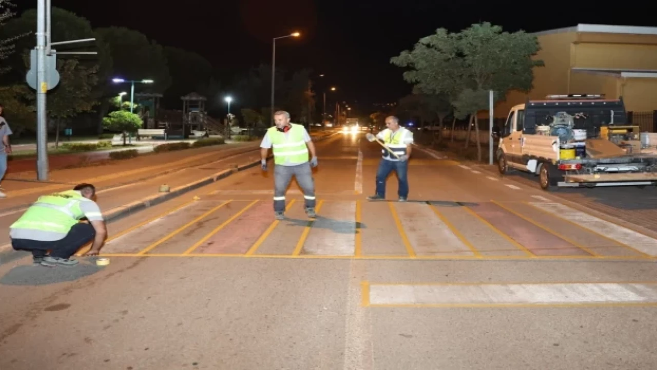 Nilüfer Belediyesi ekipleri, yaya ve araçların güvenliği için kasis, yaya geçidi ve yol şerit çizgilerini gece mesaisi yaparak yeniliyor.