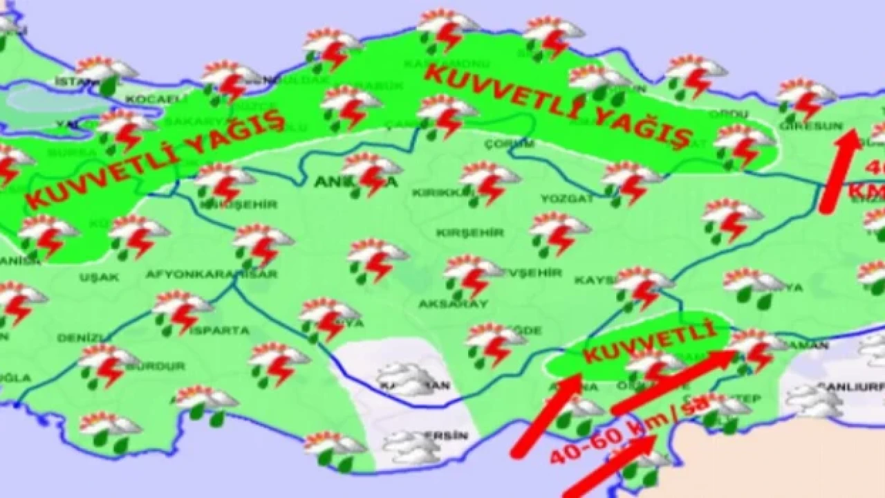 KUVVETLİ YAĞIŞ UYARISI: Yağışların; Batı Karadeniz, Orta Karadeniz’in iç kesimleri ile Balıkesir, Bursa, Bilecik, Yalova, Sakarya, Çankırı, Osmaniye ve Doğu Akdeniz’in Toroslar Mevkiinde yerel kuvvetli olması beklendiğinden ani sel, su baskını, yıldırım, yerel dolu yağışı ve yağış anında kuvvetli rüzgar gibi olumsuzluklara karşı dikkatli ve tedbirli olunması gerekmektedir.