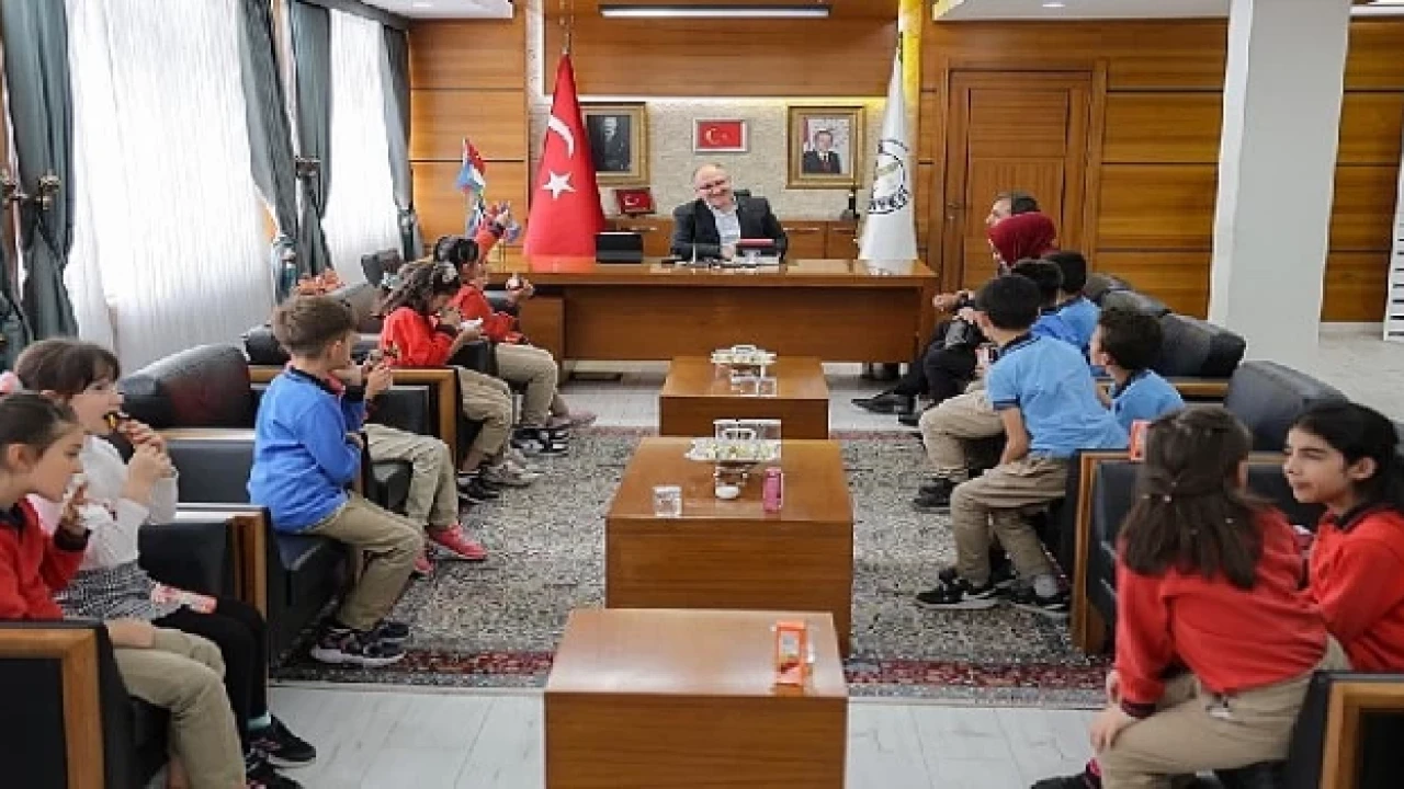 Bu kapsamda Cumhuriyetimizin 100 yılı anısına Şehit Hakan Yurtoğlu İlkokulu 3-D sınıfı öğrencileri Belediye Başkanı Hilmi Bilgin'i ziyaret ederek yazdıkları mektupları teslim ettiler.