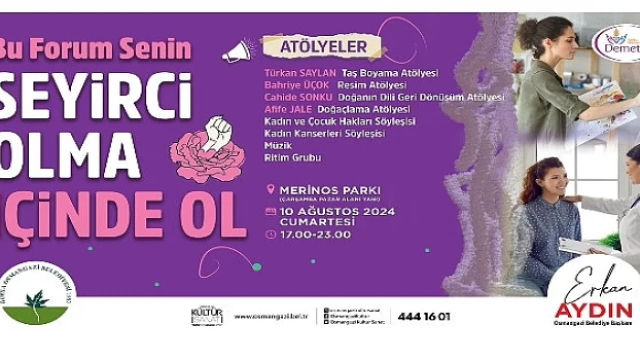 Kadınlara özel olarak gerçekleştirilecek olan ‘Bursa Kadın ve Yaşam Forumu’ 10 Ağustos Cumartesi günü Merinos Parkı’nda (Çarşamba Pazarpak Yanı) gerçekleştirilecek. Saat 17.00’da başlayacak olan Bursa Kadın ve Yaşam Forumu’nda kadınlar için Taş Boyama Atölyesi, Resim Atölyesi, Doğanın Dili Geri Dönüşüm Atölyesi ve Doğaçlama Atölyesi gibi birbirinden güzel ve renkli etkinlikler yer alacak. Ayrıca gerçekleştirilecek olan interaktif söyleşirler sayesinde katılımcılar, kadınlarda sıklıkla görülen kanser türleri ve kadın hakları konularında bilgilendirilecek. Bursa Kadın ve Yaşam Forumu’na toplumum her kesimden kadınların yanı sıra kadın haklarını savunan erkekler de davetli.