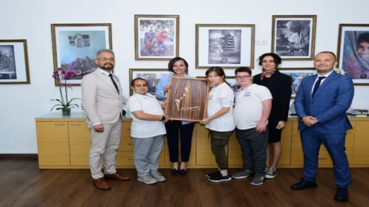 Karabağlar sınırlarında bulunan Sadettin Tezcan Özel Eğitim Meslek Okulu'nun “özel” öğrencileri, öğretmenleriyle birlikte Karabağlar Belediye Başkanı Helil Kınay'ı ziyaret etti. Geri dönüştürebilir malzemelerden yaptıkları Atatürk portresini Başkan Kınay'a armağan eden öğrenciler, 17 Mayıs'ta Kültürpark'ta açacakları sergiye Başkan Kınay’ı davet ettiler.