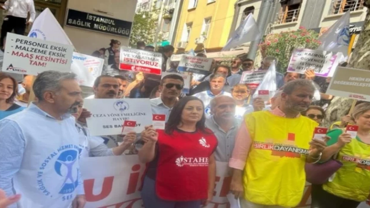 İstanbul İl Sağlık Müdürlüğü’nün anayasayı yok saydığını söyleyen sağlık emekçileri İstanbul İl Sağlık Müdürlüğü önünde toplanarak basın açıklaması yaptı.