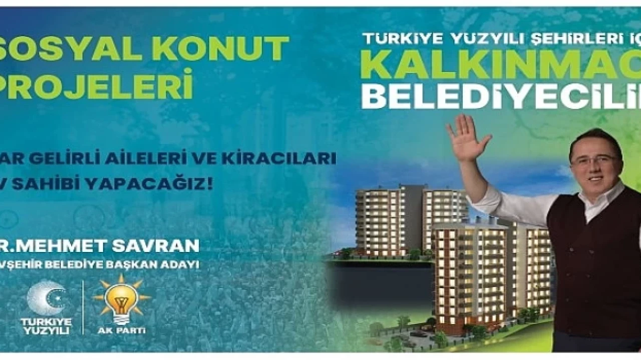AK Parti Belediye Başkan Adayı Dr. Mehmet Savran, AK Parti Nevşehir İl Başkanlığı’nda düzenlediği basın toplantısında, yeni dönemde hayata geçireceği projeler hakkında gazetecilerin sorularını cevaplandırdı. Savran, Nevşehir’deki dar gelirli ve kiracıları yakından ilgilendiren Sosyal Konut Projeleri hakkında yaptığı açıklamada, “Kendilerine ait evleri olmayan, dar gelirli vatandaşlarımız için sosyal konutlar yapacağız. Bu sosyal konutlarımızı ödeme imkânları kısıtlı vatandaşlarımıza uzun vadeli ve düşük maliyetli satacağız. Onların kira öder gibi ev sahibi olmasını sağlayacağız.” dedi.