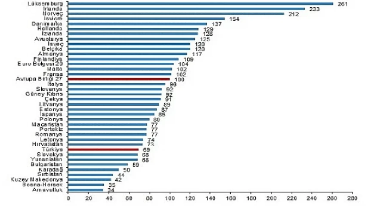 Avrupa Birliği İstatistik Ofisi (Eurostat) tarafından açıklanan SGP'ye göre kişi başına gayrisafi yurt içi hasıla (GSYH) endeksi 2022 yılı geçici sonuçlarına göre 27 Avrupa Birliği (AB) ülkesi ortalaması 100 iken, bu değer Türkiye için 69 oldu ve AB ortalamasının %31 altında kaldı.