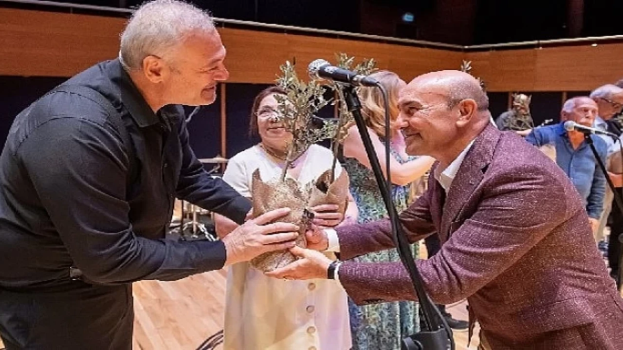 Gecenin sonunda Başkan Soyer sanatçılara zeytin fidanı verdi.