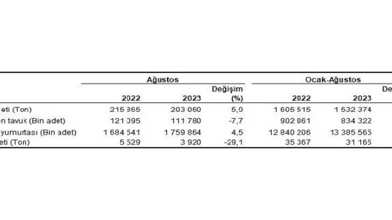 Ağustos ayında bir önceki yılın aynı ayına göre tavuk yumurtası üretimi %4,5 artarken; tavuk eti üretimi %5,9, kesilen tavuk sayısı %7,7 ve hindi eti üretimi %29,1 azaldı. Ocak-Ağustos döneminde bir önceki yılın aynı dönemine göre tavuk yumurtası üretimi %4,2 artarken; tavuk eti üretimi %4,6, kesilen tavuk sayısı %7,5 ve hindi eti üretimi %11,9 azaldı.