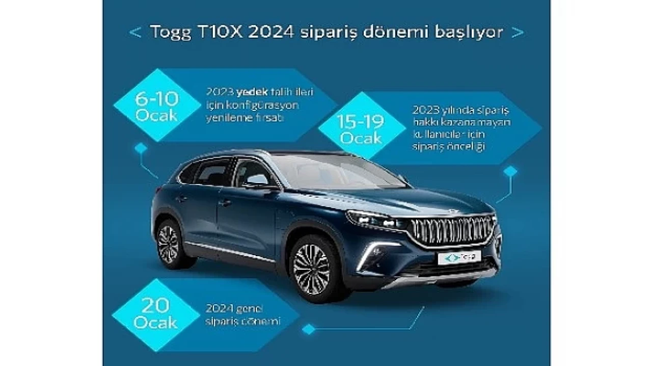 Türkiye’nin mobilite alanında hizmet veren küresel teknoloji markası Togg, 2024 yılında daha fazla T10X’i kullanıcılarla buluşturmak için çalışmalarını aralıksız sürdürüyor. 2024 yılındaki sipariş sürecini açıklayan Togg’da bu yıl çekiliş yapılmayacak, teslimatlar sipariş sırasına, konfigürasyon özelliklerine ve bunlara bağlı üretim planlamasına göre gerçekleşecek. 6-10 Ocak tarihleri arasında 2023 yılında yapılan çekilişte yedek listede yer alan kullanıcılar için konfigürasyonlarını güncelleme imkanı sunulacak. 15-19 Ocak tarihleri arasında 2023 yılı nisan ayında yapılan çekilişe katılan ancak sipariş hakkı kazanamayan kullanıcılara sipariş oluşturma önceliği verilecek. 20 Ocak itibarıyla da sipariş ekranları tüm bireysel kullanıcılar için açılacak. Togg, 2024 yılında kurumsal kullanıcılardan da sipariş toplayacak.