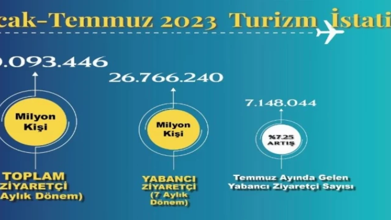 Türkiye, 2023 yılının ilk 7 ayında toplam 30 milyon 93 bin 446 ziyaretçiyi ağırlarken turizmde rekor yılı olan 2019’daki 26 milyon 524 bin rakamını geçti.