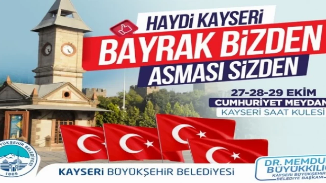Başkan Büyükkılıç, “Şanlı bayrağımızın Kayseri’mizin cadde ve sokaklarının yanı sıra evlerimizin balkonlarında ve pencerelerinde dalgalanması için ‘Haydi, Kayseri! Bayrak bizden, asması sizden’ sloganı ile vatandaşlara bayrak dağıtacağız. Ekiplerimiz, 27, 28 ve 29 Ekim günlerinde Cumhuriyet Meydanı Saat Kulesi altındaki Büyükşehir Belediyesi İletişim Merkezi’nde vatandaşlara Türk Bayrağı dağıtacak” diye konuştu.