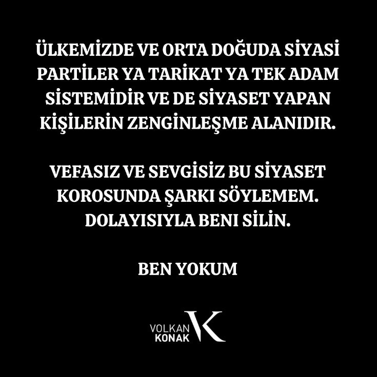 Konak, "Ülkemizde ve Orta Doğuda siyasi partiler ya tarikat ya tek adam sistemidir ve de siyaset yapan kişilerin zenginleşme alanıdır. Vefasız ve sevgisiz bu siyaset korosunda şarkı söylemem. Dolayısıyla beni silin. Ben yokum" dedi.