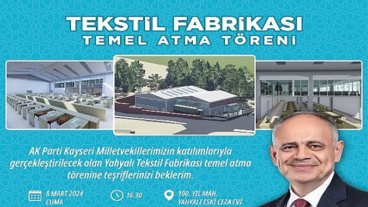 Yahyalı Belediye Başkanı Esat Öztürk, Yahyalı ilçesine yapılacak olan yeni tekstil fabrikasının temel atma töreninin 8 Mart 2024 Cuma günü saat 16.30'da gerçekleşeceğini duyurdu. Bu önemli adım, bölgeye 200 yeni iş imkanı sağlayacak ve bölgenin ekonomik kalkınmasına büyük katkıda bulunacak.