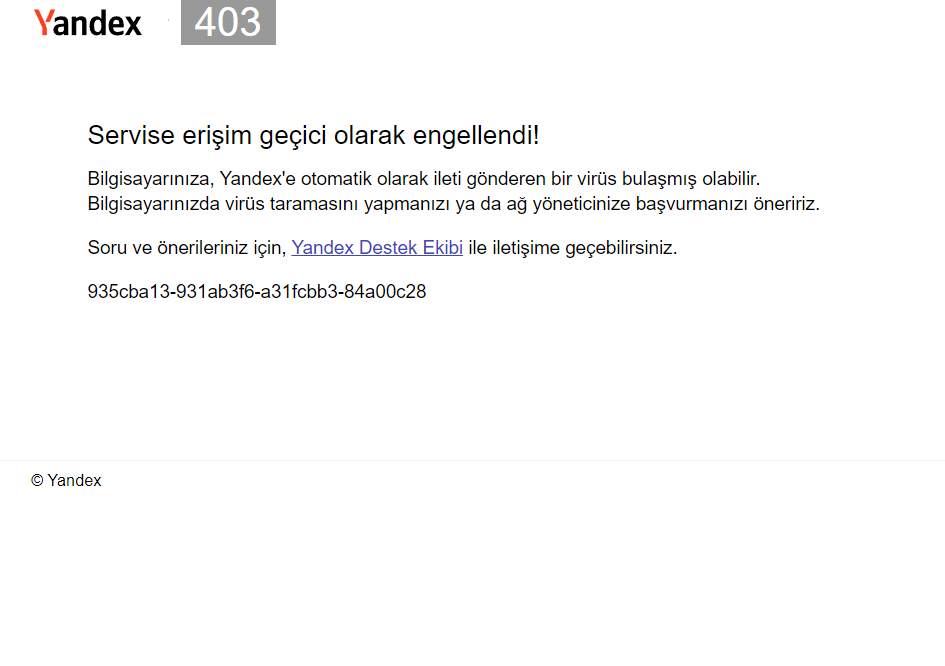 Bilgisayarınızda virüs taramasını yapmanızı ya da ağ yöneticinize başvurmanızı öneririz.Soru ve önerileriniz için, Yandex Destek Ekibi ile iletişime geçebilirsiniz."