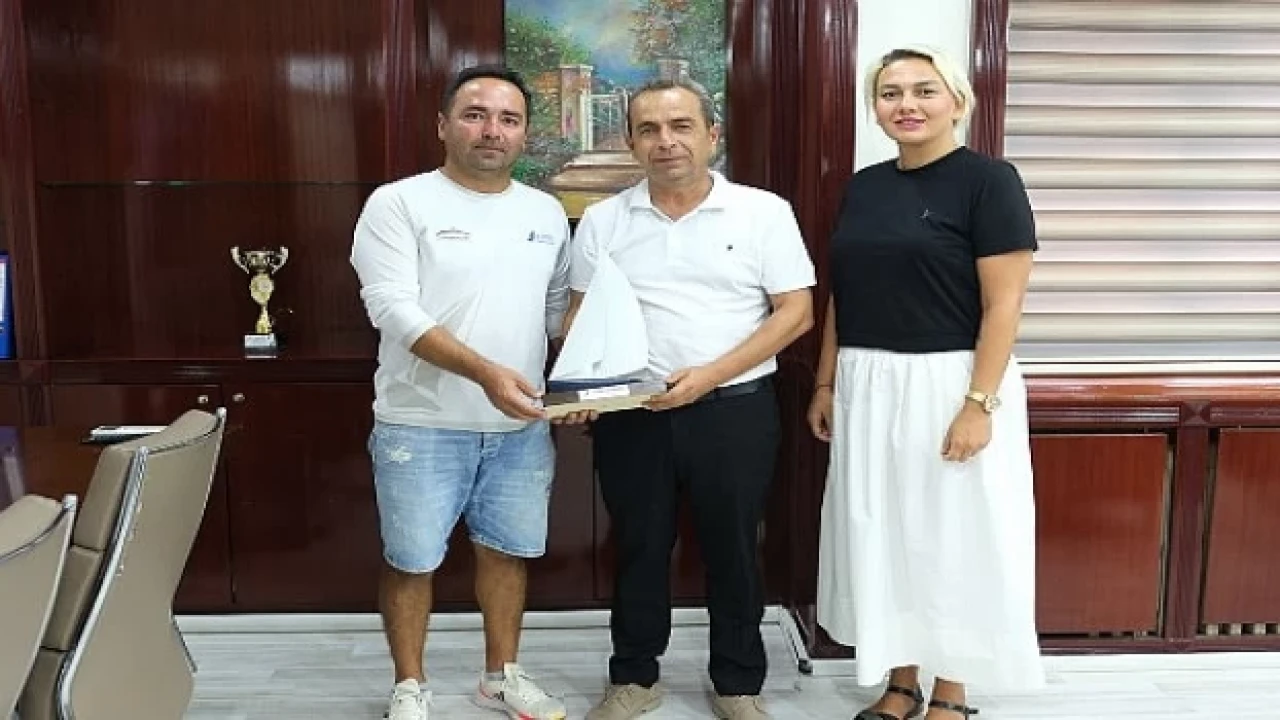 Yarışlar öncesi Kemer Belediyespor Yat ve Yelken Kulübü Başkan Yardımcısı Fırat Yılmaz ve yönetim kurulu üyesi Fatma Yılmaz Taze, Kemer Belediye Başkan Yardımcısı Mehmet Derya Baytekin’i ziyaret etti.