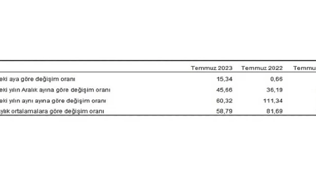 YD-ÜFE (2010=100) 2023 yılı Temmuz ayında bir önceki aya göre %15,34, bir önceki yılın Aralık ayına göre %45,66, bir önceki yılın aynı ayına göre %60,32 ve on iki aylık ortalamalara göre %58,79 artış gerçekleşti.