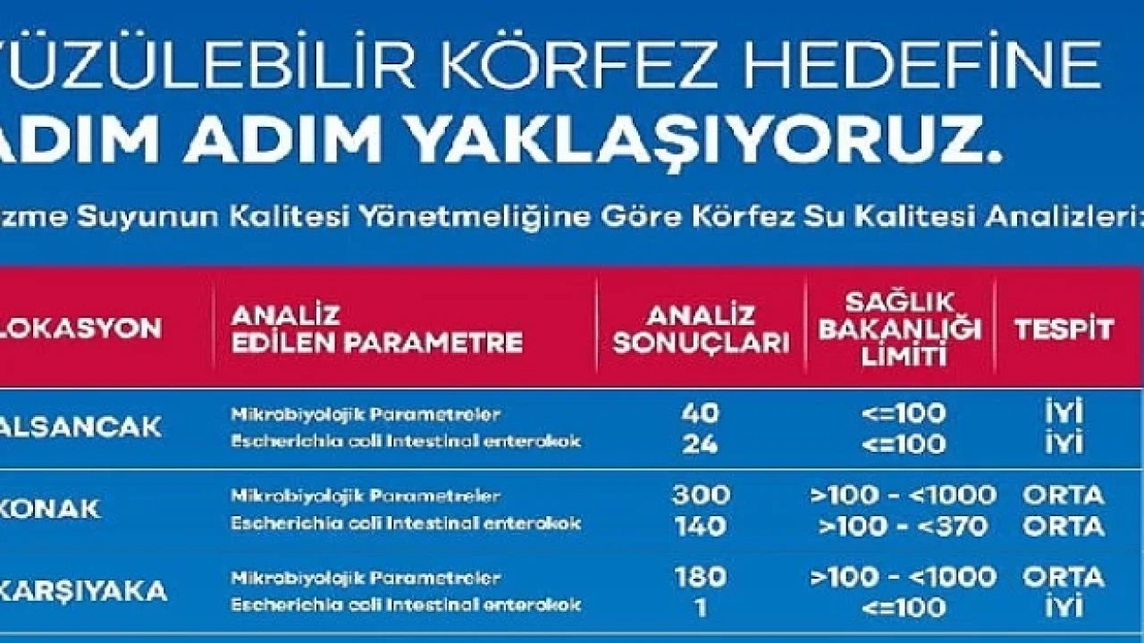 Rapora göre; özellikle Mavişehir, Karşıyaka Yelken Kulübü, Konak Alsancak, Göztepe, Poligon, Üçkuyular İskelesi, İnciraltı Kent Ormanı Engelliler Parkı ve Sahilevleri bölgelerindeki ölçüm sonuçlarının genel olarak iyi ve orta kalite sınıfında olduğu gözlendi. Yağışlı havalarda taşkınlardan kaynaklı olarak körfezin su kalitesi dönemsel olarak değişkenlik göstermekle birlikte yoğun yağışların yaşanmadığı yaz aylarında su kalitesi daha iyi kalite sınıfında izlendiği görüldü.