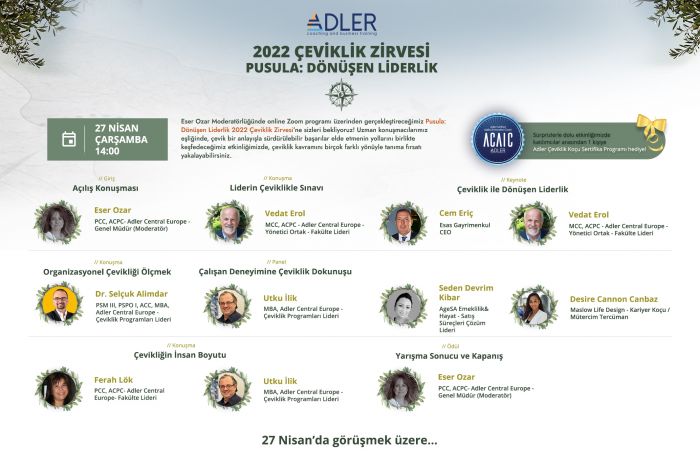 Zirvenin sonunda yapılacak yarışmada, sorulara doğru yanıtı en hızlı şekilde veren bir katılımcıya uluslararası geçerliliği bulunan ICF onaylı, 17 gün sürecek “Adler Çeviklik Koçu Sertifika Programı”na ücretsiz katılım hakkı sunulacak.