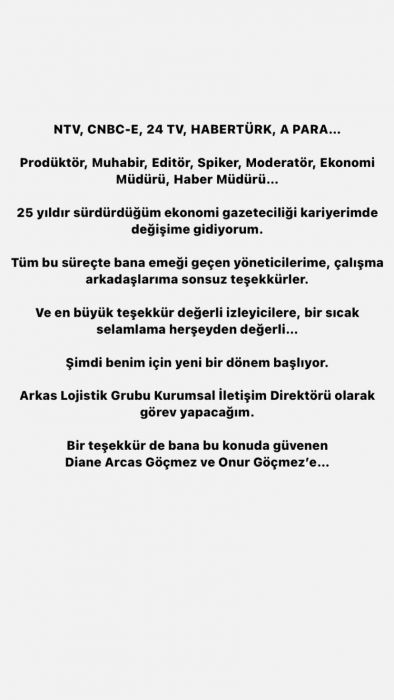 Sözlerini şu şekilde sürdüren Kuter, "2 yıldır çalıştığım A Para TV’den ayrılıyorum. Turkuvaz Medya Yönetim Kurulu Başkanvekili Serhat Albayrak’a, Genel Müdür Abdulhalik Çimen’e, A Para Yayın Koordinatörü sevgili dostum Özlem Doğaner’e ve tüm çalışma arkadaşlarıma teşekkür ederim." dedi.