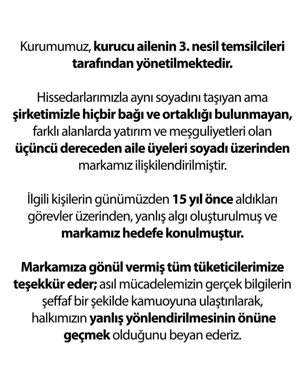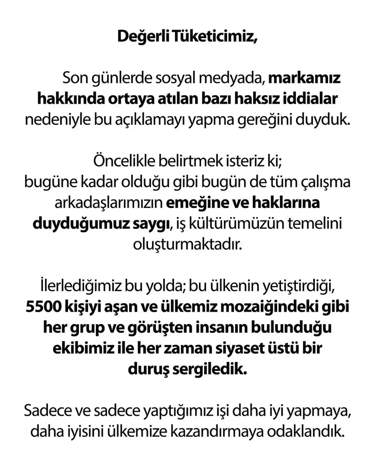 “Markamız hakkında ortaya atılan haksız iddialar nedeniyle bu açıklamayı yapma gereği duyduk” ifadelerini kullanan şirket, ekibiyle her zaman siyaset üstü bir duruş sergilediklerini söyledi.