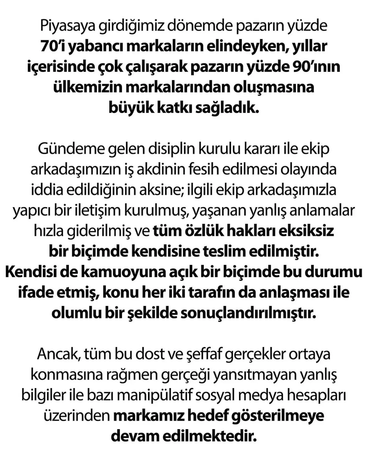 Açıklamada, sosyal medyada gündeme gelen bir çalışanın iş akdinin feshiyle ilgili iddiaların gerçeği yansıtmadığı ifade edildi. İlgili çalışanla yapıcı bir iletişim kurulduğu, yanlış anlaşmaların giderildiği ve tüm özlük haklarının eksiksiz teslim edildiği belirtildi. Ayrıca, ilgili kişinin durumu kamuoyuna açık şekilde paylaştığı ve sürecin iki tarafın uzlaşısıyla sonuçlandığı bilgisi verildi.