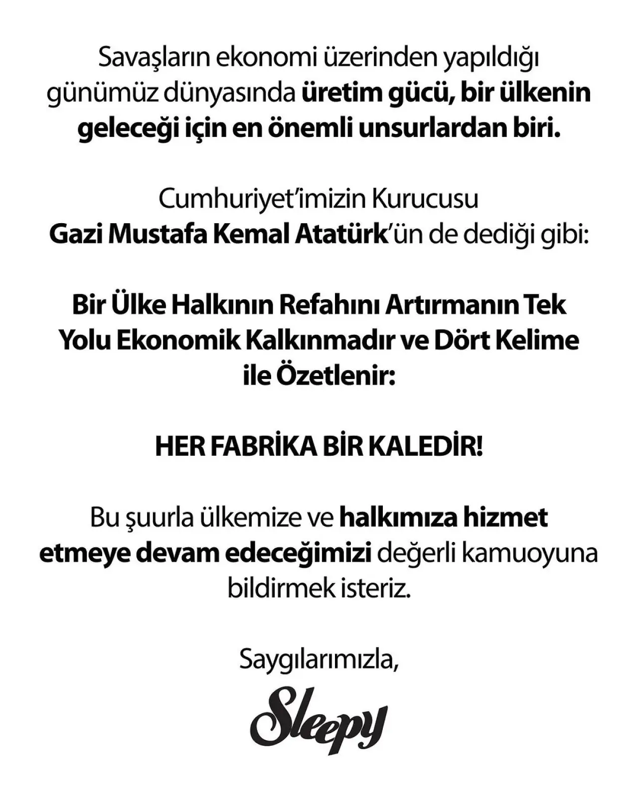 Sleepy, yaptığı açıklamada üretimin ve ekonomik kalkınmanın önemine vurgu yaparak, “Her fabrika bir kaledir” sözünü öne çıkardı. Atatürk’ün “Bir ülke halkının refahını artırmanın tek yolu ekonomik kalkınmadır” sözüne atıfta bulunan şirket, üretim gücünün bir ülkenin geleceği için en önemli unsur olduğunu belirtti.