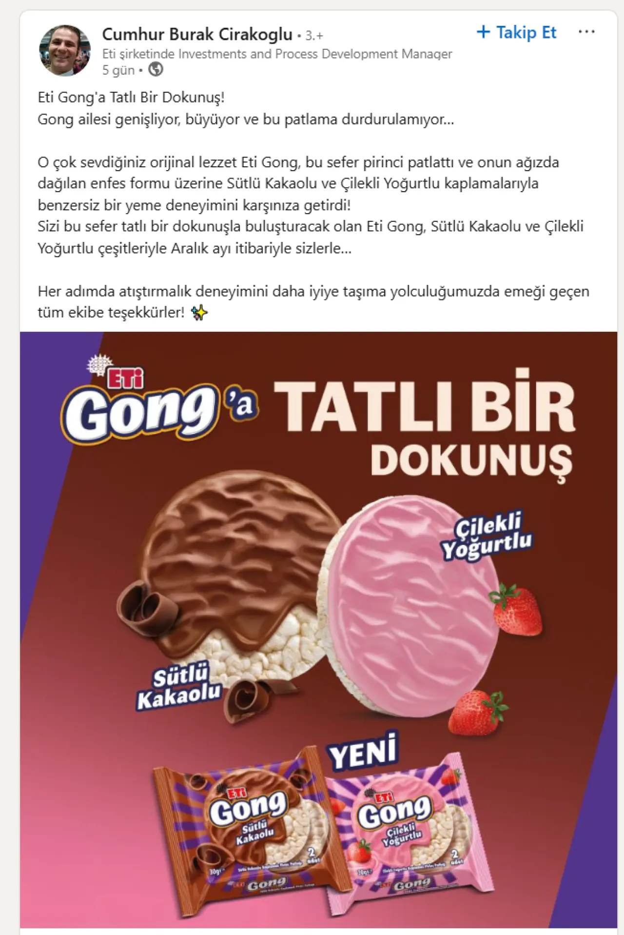 "Gong ailesi olarak yepyeni bir kategoriye adım atıyoruz. Bugüne kadar tuzlu atıştırmalıklarla tanıdığınız markamız, şimdi ilk kez tatlı bir ürün ile sektöründe güçlü bir açılım yapıyor. Bu lansman, sadece yeni bir ürün çıkarmak değil; aynı zamanda tüketici beklentilerini yeniden yorumlayan, kategoriler arasında köprü kuran yenilikçi bir yaklaşımın başlangıcı. Ürün geliştirme ekibi olarak yaptığımız çalışmalar, tatlı ve tuzlu kategorisine modern, taptaze ve güçlü bir dokunuş getiriyor."