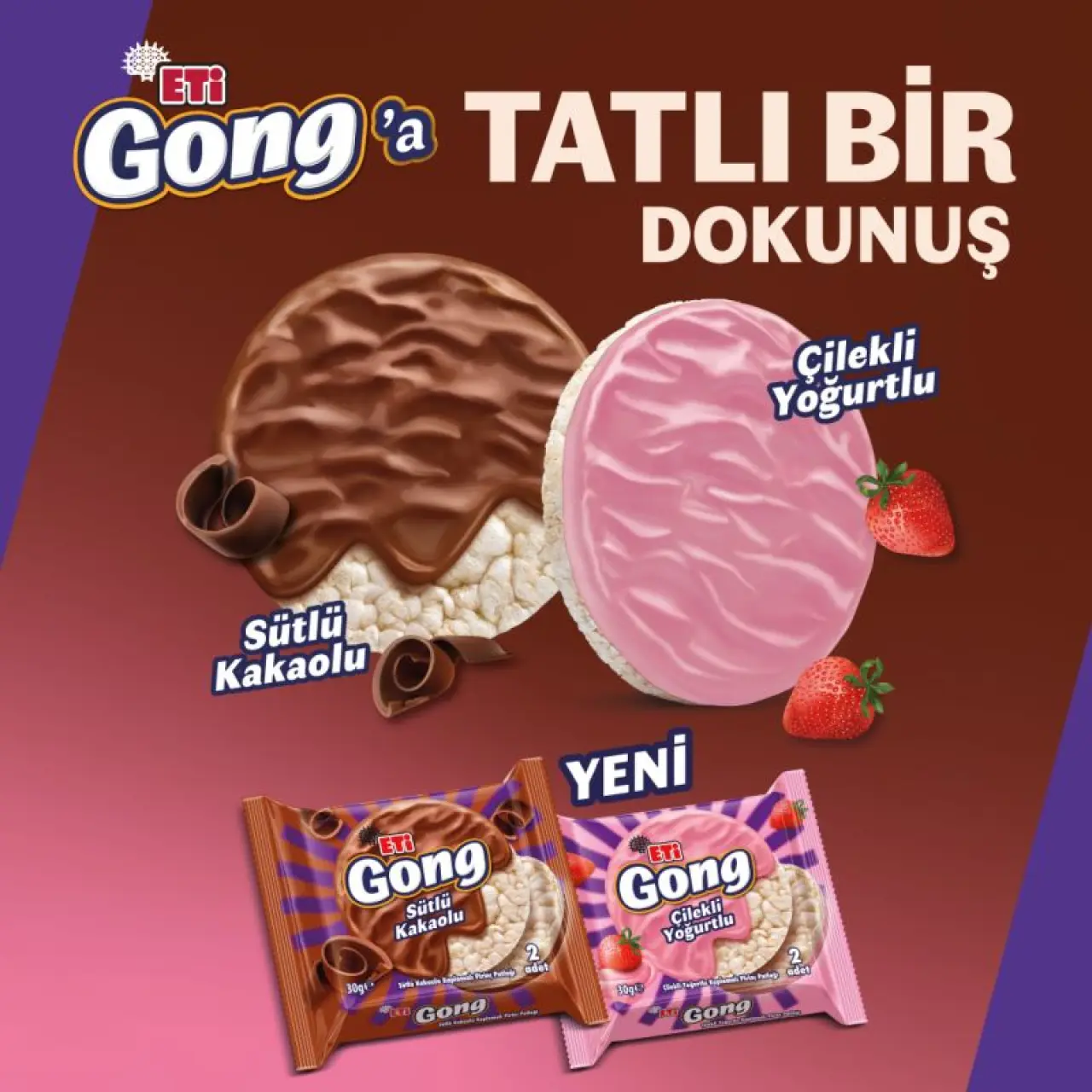 "Gong ailesi genişliyor, büyüyor ve bu patlama durdurulamıyor. O çok sevdiğiniz orijinal lezzet Eti Gong, bu sefer pirinci patlattı ve onun ağızda dağılan enfes formu üzerine Sütlü Kakaolu ve Çilekli Yoğurtlu kaplamalarıyla benzersiz bir yeme deneyimini karşınıza getirdi. Sizi bu sefer tatlı bir dokunuşla buluşturacak olan Eti Gong, Aralık ayı itibariyle sizlerle."