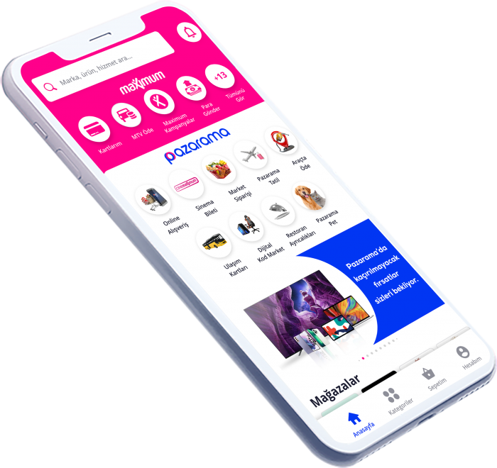 Maximum Mobil’i indirerek kolayca ulaşabileceğiniz Pazarama’da ürün ve hizmet satışlarının yanı sıra mobil ödeme deneyimi de sunuluyor. Pazarama’da giyimden kırtasiyeye, elektronikten evcil hayvan ürünlerine ve oyunlara kadar çok geniş bir yelpazede farklı ürünleri bulmak mümkün.