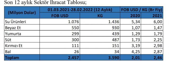 Altsektörler hakkında da bilgi veren Müjdat Sezer, Türkiye genelinde 2018 yılında582 milyon dolar olan su ürünleri ihracatının 2021 yılı sonunda 1 milyar 401milyon dolara çıktığını belirterek aynı dönemde, beyaz et ihracatının 554milyon dolardan 861 milyon dolara, yumurta ihracatının 406 milyon dolardan 428milyon dolara, süt ürünleri ihracatının 307 milyon dolardan 439 milyon dolarave et ürünleri ihracatının da 81 milyon dolardan 143 milyon dolara yükseldiğinibildirdi.