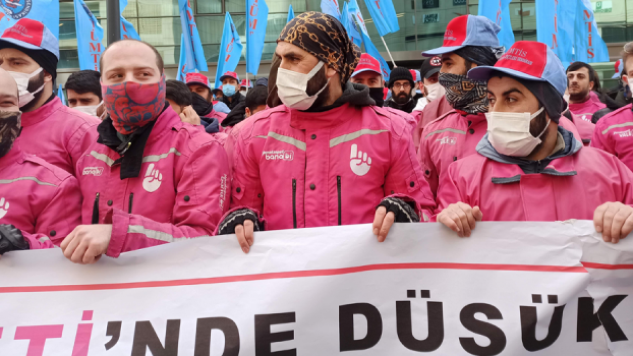 Taleplerini dört maddede sıralayan çalışanlar, “5 bin 500 TL maaş, prim ve yan hak talep ediyoruz. Hakkını arayan hiçbir işçi ve kurye işten çıkarılmasın, iş kolumuz derhal taşımacılığa geçirilsin ve sendikal faaliyet güvence altına alınsın” ifadelerine yer verdi.