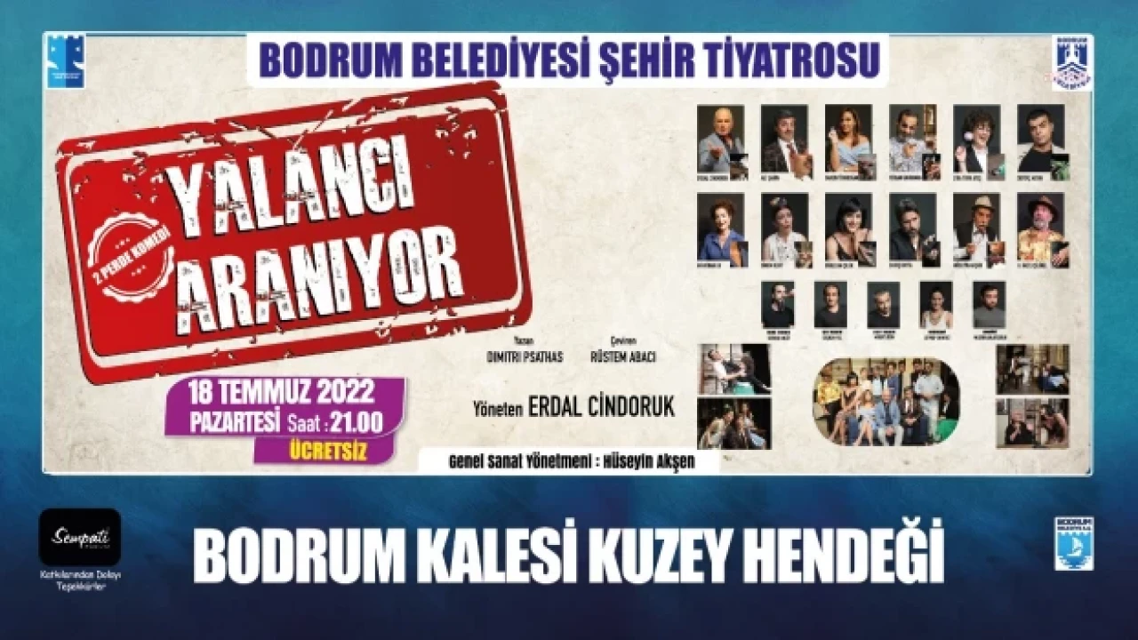 Bodrum Belediyesi Şehir Tiyatrosu, yaz sezonuna “Yalancı Aranıyor” adlı politik komedi oyunu ile ’merhaba’ diyor. 18 Temmuz Pazartesi günü saat 21.00’de Bodrum Kalesi Sahnesi’nde seyirci ile buluşacak Dimirti Psathas’ın yazdığı oyunu, B.B.Ş.’nin usta oyuncularından, aynı zamanda sinema ve dizi oyuncusu Erdal Cindoruk yönetiyor.
