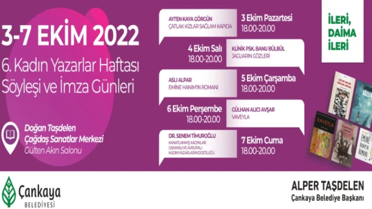 Toplumsal cinsiyet eşitliği konusundaki çalışmalarıyla Türkiye’nin ilk “Mor Bayrak”lı yerel yönetimi olan Çankaya Belediyesi, kadın yazarları okurlarıyla buluşturuyor. Bu yıl altıncısı düzenlenen Kadın Yazarlar Haftası, 3-7 Ekim tarihleri arasında gerçekleştirilecek. Doğan Taşdelen Çağdaş Sanatlar Merkezi'nde düzenlenecek etkinlikte; Ayten Kaya Görgün, Banu Bülbül, Aslı Alpar, Gülhan Avşar ve Senem Timuroğlu eser ve söyleşileriyle yer alacak.
