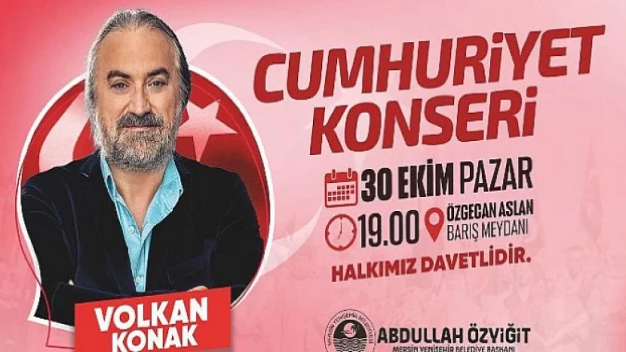 Mersin Yenişehir Belediyesi, 29 Ekim Cumhuriyet Bayramı’nın 99.yılını Cumhuriyet Konseri ile kutlayacak. Yenişehir Belediyesi kutlamalar kapsamında sevilen sanatçı Volkan Konak’ı 30 Ekim Pazar günü saat 19.00’da Özgecan Aslan Barış Meydanı’nda Mersinlilerle buluşturacak.