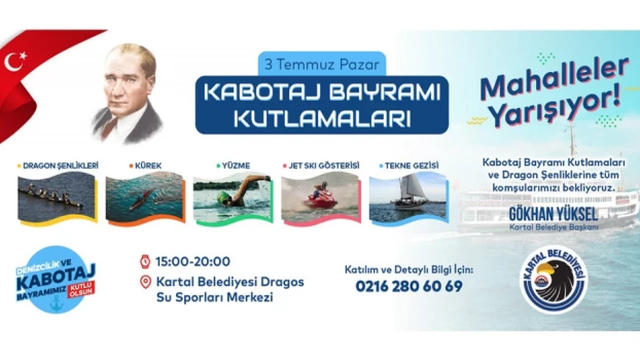 1 Temmuz 1926'da yürürlüğe giren Kabotaj Kanunu kapsamında Milli Bayram ilan edilen Denizcilik ve Kabotaj Bayramı’nda Kartal, nefes kesen yarışlara ve renkli etkinliklere sahne olacak.