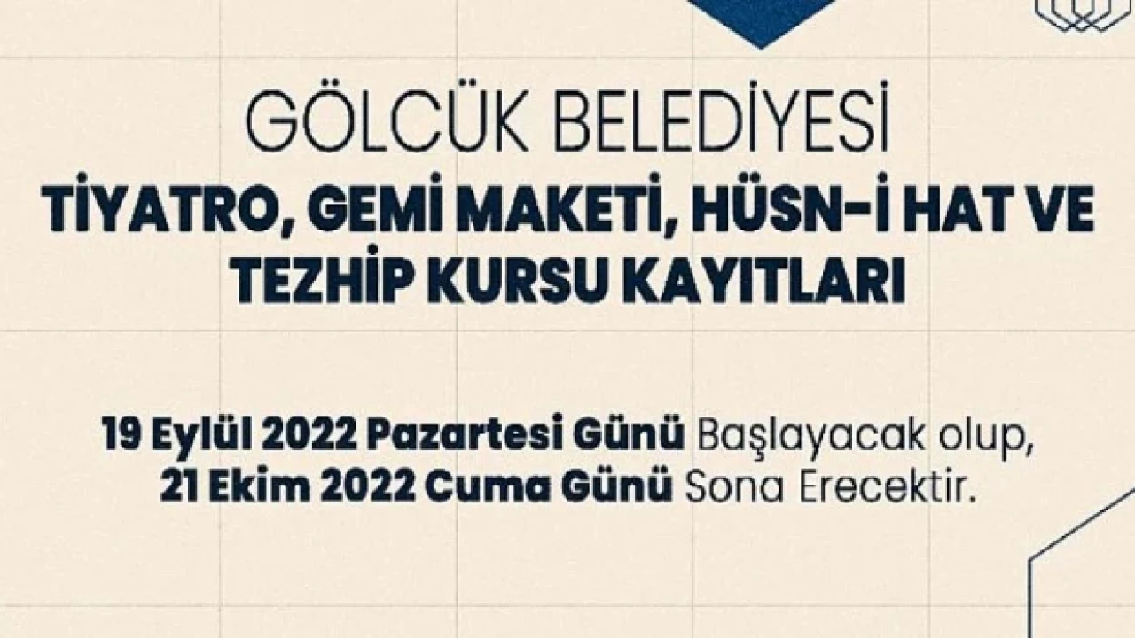 Gölcük Belediyesi tarafından yeni dönemde açılacak tiyatro, gemi maketi, hüsn-i hat ve tezhip kursları için 19 Eylül Pazartesi günü başlayacak olan kayıt işlemleri, 21 Ekim Cuma günü sona erecek. Ücretsiz sanat kurslarına müracaatlar, Gölcük Belediyesi Mehmet Akif Ersoy Kültür Merkezi’ne yapılacak. Kurslara kayıt olmak isteyenler detaylı bilgi için 0 262 412 88 47 numaralı telefonu arayabilirler.