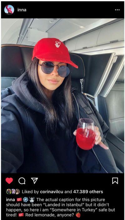 Hava şartları nedeniyle Çorlu inmek zorunda kalan INNA Instagram hesabında paylaştığı fotoğrafında " Bu fotoğrafta İstanbul'da olduğumu göstermeliydim. Ama olmadı. Türkiye'de bir yerde güvendeyim. Fakat yorgunum".