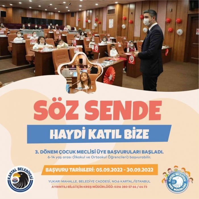 30 Eylül 2022 tarihinde sonlanacak başvurular için öğrencilerin Kartal Belediyesi Çocuk Meclisi Üye formunu https://bitly.com/CocukMeclisiOnKayit linki üzerinden doldurmaları gerekiyor. Başvuru ve detaylı bilgi için Kreş Müdürlüğü’nün 0216 280 57 64/ 65-73 numaralı hattı üzerinden hizmet verilecek.