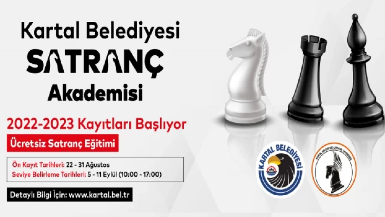 Kartal Belediyesi Gençlik ve Spor Hizmetleri Müdürlüğü’ne bağlı olarak hizmet veren Satranç Akademisi’nde 2022-2023 eğitim dönemine katılmak isteyen çocuklar ve gençler, 22-31 Ağustos 2022 tarihleri arasında ön kayıtlarını yaptırabilecek. 6-18 yaş arası çocukların ve gençlerin başvuru yapabileceği Satranç Akademisi’nin kayıtları, Kartal Belediyesi’nin internet sitesi üzerinden yapılabilecek.