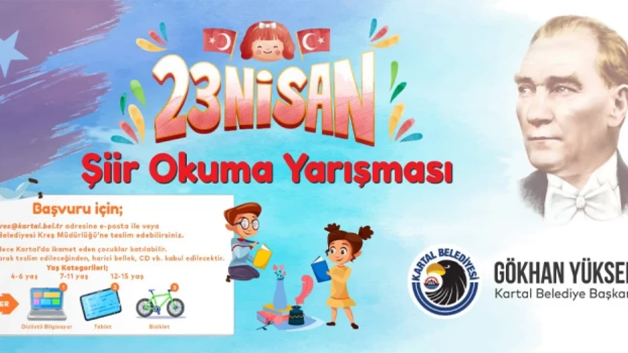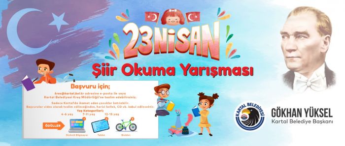 Kartal Belediyesi Kreş Müdürlüğü, Büyük Önder Gazi Mustafa Kemal Atatürk'ün tüm dünya çocuklarına armağan ettiği 23 Nisan Ulusal Egemenlik ve Çocuk Bayramı kapsamında ’23 Nisan’ temalı şiir okuma ve resim yarışması düzenliyor.
