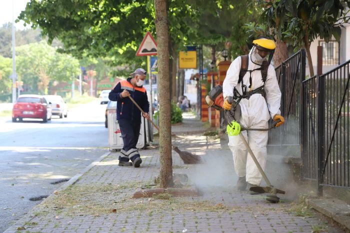 Ayrıca ilçe genelinde kaldırım ve duvar kenarlarında görüntü kirliliği oluşturan yabani otlara da müdahalede bulunan ekipler, boş arazilerde de olası bir yangını önlemek amacıyla ve kene gibi böceklere karşı yabani otları temizliyor.