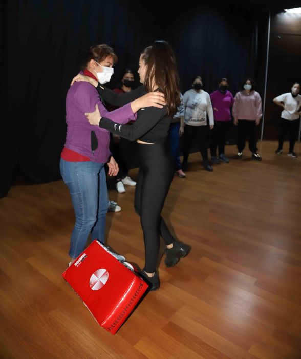 Son yıllarda artan kadına yönelik şiddete ve kadın cinayetlerine hem dikkat çekmek, hem de kadınların herhangi bir saldırı ya da şiddet durumu ile karşılaştıklarında kendilerini koruyabilmeleri için yapılan atölyede Krav Maga Eğitmeni Meltem Yalçın, pek çok önemli bilginin yanı sıra öz savunma tekniklerini de uygulamalı olarak gösterdi.
