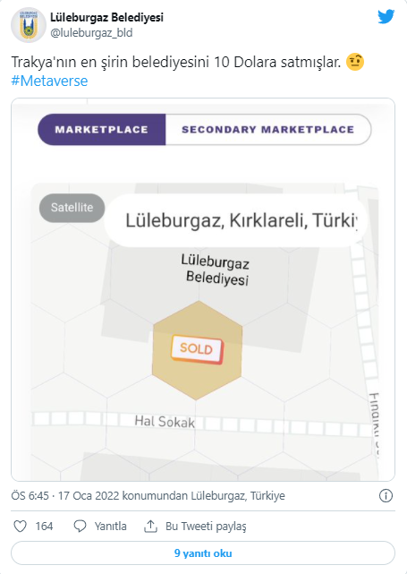 Lüleburgaz Belediyesi Twitter hesabından, "Trakya'nın en şirin belediyesini 10 dolara satmışlar" paylaşımında bulundu.