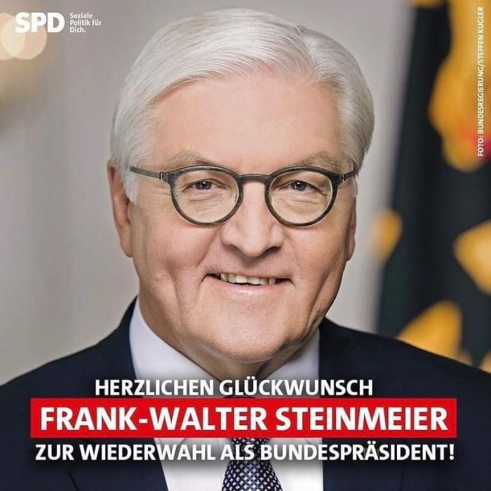 Son seçimde aday olan Frank-Walter STEINMEIER daha önce SPD`de çeşitli görevlerde bulunmuş, SCHRÖDER Hükümeti`nde önce Şansölye`nin sağ kolu olarak Başbakanlıkta görev ifa etmiş ve daha sonra Dişişleri Bakanı olarak başarılı bir performans sergilemiştir. Son beş yılda Cumhurbaşkanı olarak gösterdiği başarılı dönem, ikinci defa seçilmesinin de nedeni olmuştur. Cumhurbaşkanı seçilmeden önce, SPD`li bir yoldaşımız olarak (Dışişleri Bakanı olmasına rağmen) yoldaşlarıyla aynı göz hizasında ilişkilerini sürdürmüştür. SPD`den dostumuz olan Sayın STEIMEIER çok müthiş bir hümanisttir. Hem de öyle böyle değil. Bir böbreğini eşine bağışlayacak kadar özverilidir.