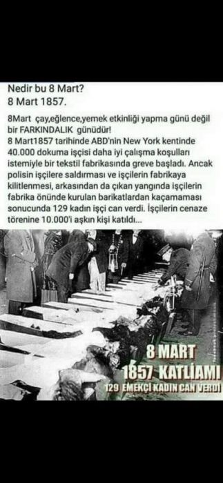 1857 yılında New York’ta tekstil endüstrisinde çalışan kadınlar grev yapınca ortalık karışmış polisin müdahalesi ile 129 kadın işçi hayatını kaybetmişti. Fotoğrafta detayları okuyabilirsiniz.