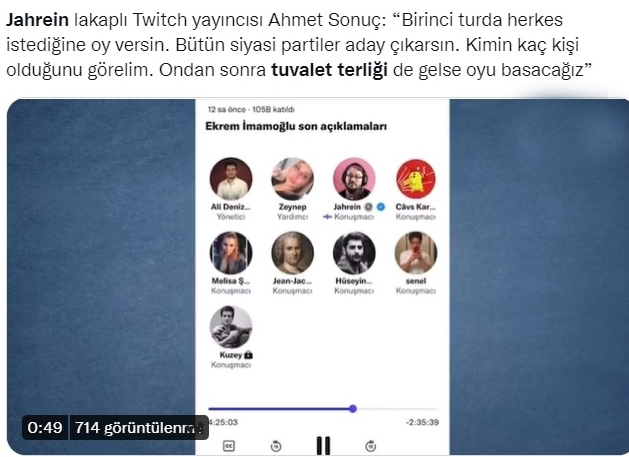 İktidar, sosyal medya fenomeni Jahrein’in (Ahmet Sonuç) bir sohbet odasındaki “Birinci turda herkes istediğine oy versin. Bütün siyasi partiler aday çıkarsın. Ondan sonra tuvalet terliği de gelse oyu basacağız” sözlerini çok sevdi. AKP Genel Başkan Yardımcısı Hamza Dağ’ın, “Tuvalet terliği yaklaşımı, millete ne denli çirkin baktıklarını ortaya çıkardı” sözleri de iktidar medyasında geniş yer buldu; ardından yazmayan kalmadı neredeyse. İşte birkaç örnek: