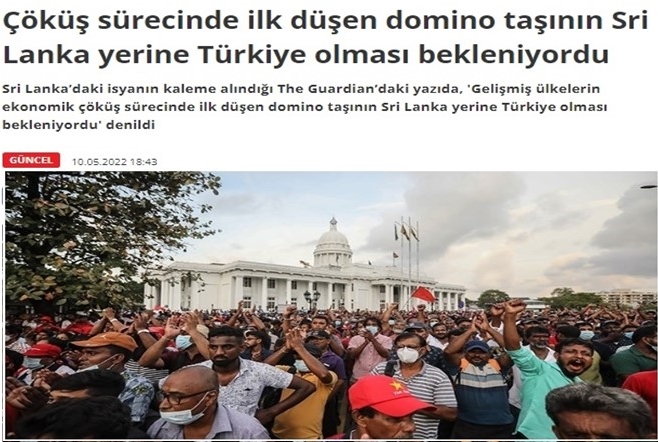 The Guardian’daki yazıyla ilgili Türkiye’de yayımlanan haberlerde “Gelişmiş ülkelerin ekonomik çöküş sürecinde ilk düşen domino taşının Sri Lanka yerine Türkiye olması bekleniyordu” diye tırnak içinde verilen cümle yazının orijinal metninde yoktu.