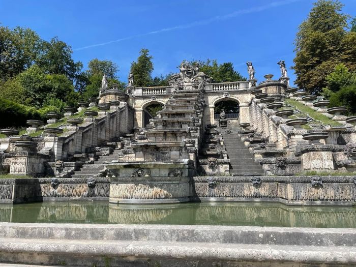 -A, işte o meşhur teraslı havuzlar, rüya gibi, her bir havuz ayrı ayrı incelenmeye değer heykellerle bezeli, kat kat sıralı havuzlar şelale etkisi yaratmak için yapılmış. Nedense şimdilerde havuzlardan aşağıya kat kat dökülen sular kesintiye uğratılmış. Kim bilir? Belki de renovasyon yapıyorlardır. A, ama havuzlarda yüzen şu kocaman balıklara ne demeli?