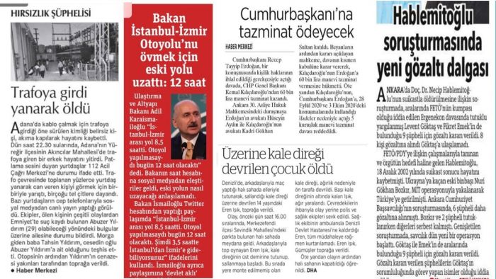 Bu yazım tekniği özellikle kısa haberlerde çok fena sırıtıyor, okuyanı da sıkıyor. Çünkü 4-5 cümlelik kısacık haberlerde sırf “flaş” olsun diye aynı cümleler tekrarlanıyor. Süregiden bu yanlışın anlaşılması bakımından birkaç örnek vereyim. Gazete Pencere’nin 8 Haziran’daki “Bakan İstanbul-İzmir Otoyolu’nu övmek için eski yolu uzattı” haberi dört cümleden oluşuyordu. Ama “Bakan Karaismailoğlu ‘İstanbul-İzmir arası yol 8,5 saatti. Otoyol yapılmasaydı bugün 12 saat olacaktı’ dedi” cümlesi iki kez tekrarlanmıştı.