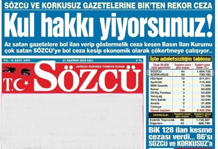 - Sözcü, Basın İlan Kurumu’nun Sözcü ve Korkusuz’a verdiği ilan kesme cezalarını aktardığı “Kul hakkı yiyorsunuz” haberinde BirGün, Cumhuriyet, Evrensel ve Yeni Asya’ya verilen cezalardan hiç bahsetmedi.