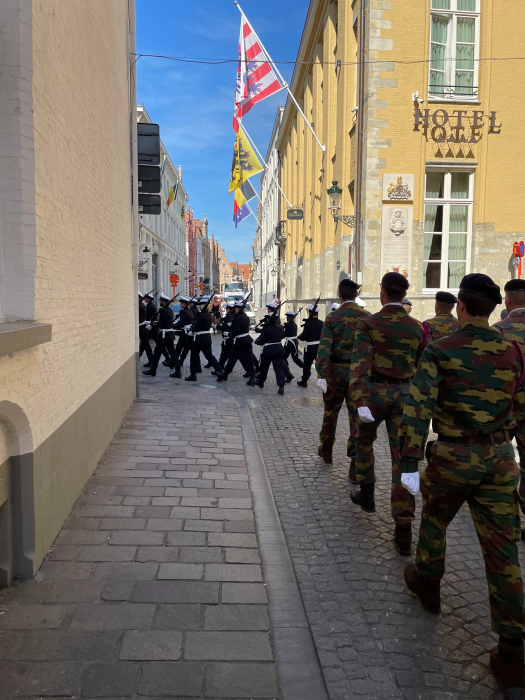 -Bu silahlı askerler de nereden çıktı? Şu bando sesleri de ne? Yoksa huzur kenti Brugge’de yine kalkışma mı oluyor? Diye şaşırdınız mı? Evet, ben de çok şaşırdım, dün tam da Belediye Binasının önüne yavaş yavaş askerler gelmeye başladı, sonra sayıları epey arttı, “n’oluyor?” diye ben de merak edip sordum, binbaşı Vogels anlattı. Meğer “Deniz Kuvvetleri Günü” imiş, yeni atanan Deniz Kuvvetleri Komutanı ile eskisi arasında devir teslim töreni de aynı güne denk gelmiş, kent merkezinde trafik iki üç saat kadar durdu, bandoyla marşların da çalındığı töreni izledik.