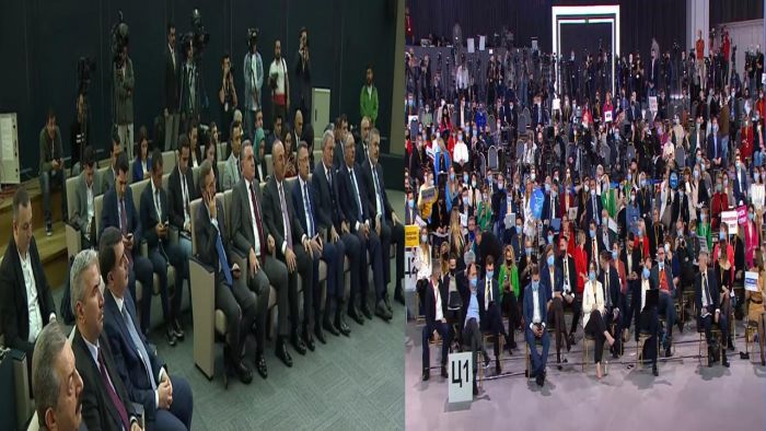 İki basın toplantısından iki kare. Birinci kare, Cumhurbaşkanı Erdoğan’ın NATO Zirvesi’ne katılmak üzere İspanya’ya hareketinden önce düzenlediği basın toplantısında çekilmiş. Ön sırada bürokratlar ve atanmış bakanlar oturuyor. İçlerinde İletişim Başkanı Fahrettin Altun da var, notlar alıyor dinlerken. Az sayıdaki gazeteci de bürokratların arkasında yer bulabilmiş.
